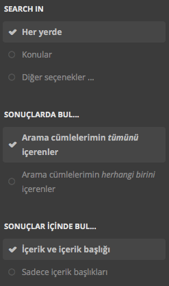 Forumda arama yapmak için arama sistemini kullanabilirsiniz. Arama sistemi, üye adınızın yer aldığı üst menüde (header) simgesiyle yer almaktadır. Arama yapmak için ''Araştır'' kısmına metni giriniz. Daha sonra karşınıza aşağıda yer alan açılır menünün çıktığını göreceksiniz : Bu açılır menüden aramanızla ilgili gerekli komutları seçebilirsiniz. Seçiminizi yaptıktan sonra butonuna tıklayarak, hızlıca arama sonuçlarına ulaşabilirsiniz. Dikkat: İnteraktif yarışmalar için arama yaptığınızda, açılır menüden aşağıda verilen seçenekleri mutlaka seçiniz. Bu seçenekler size en doğru sonuçları verecektir : Konular Sadece içerik başlıkları2 points