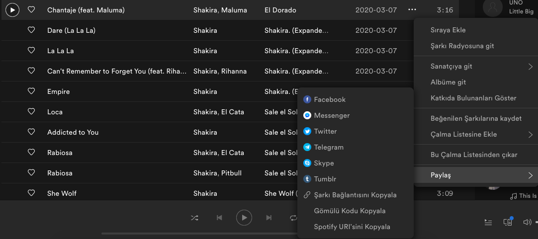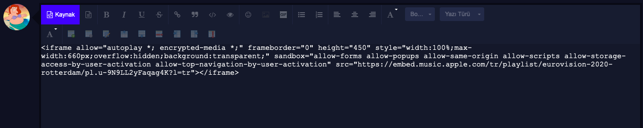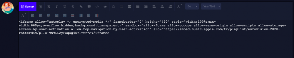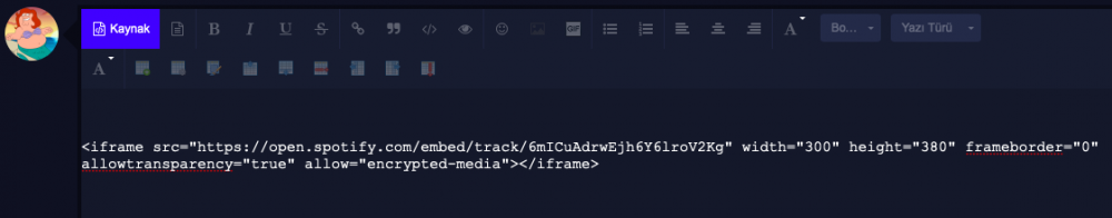 Merhaba arkadaşlar, Spotify'dan kaynaklanan bir problem nedeniyle linki direkt yapıştırdığımız gibi mesajın içerisine çalma listelerini veya şarkıları entegre edememeye başladık. Bu sorun Spotify teknik ekibi tarafından çözülene kadar aşağıda anlattığım yol ile entegre işlemini gerçekleştirebilirsiniz: 1. Adım: Ekleyeceğiniz şarkıyı veya playlisti açın. Apple Music'te bir playlistin görünümü bu şekildedir: 1.1.: Şu simgeye tıklayın: 2.Adım: Simgeye tıkladığınızda açılan menüden Paylaş > Gömme kodunu kopyala yolunu izleyin. 3. Adım: Forumda playlist/şarkı ekleyeceğiniz mesaja gelin ve editörde "Kaynak" yazısına tıklayın. 4. Adım: Kopyaladığınız kodu yapıştırın. 5. Adım: Kodu yapıştırdıktan sonra tekrar editördeki "Kaynak" yazısına tıklayın, playlistin/şarkının önizlemesini görmeye başlayacaksınız. Sonra mesajını yollayabilirsiniz. Spotify'da da tamamen aynı yolu izliyoruz. 1. Adım: 2. Adım: 3. Adım:1 point