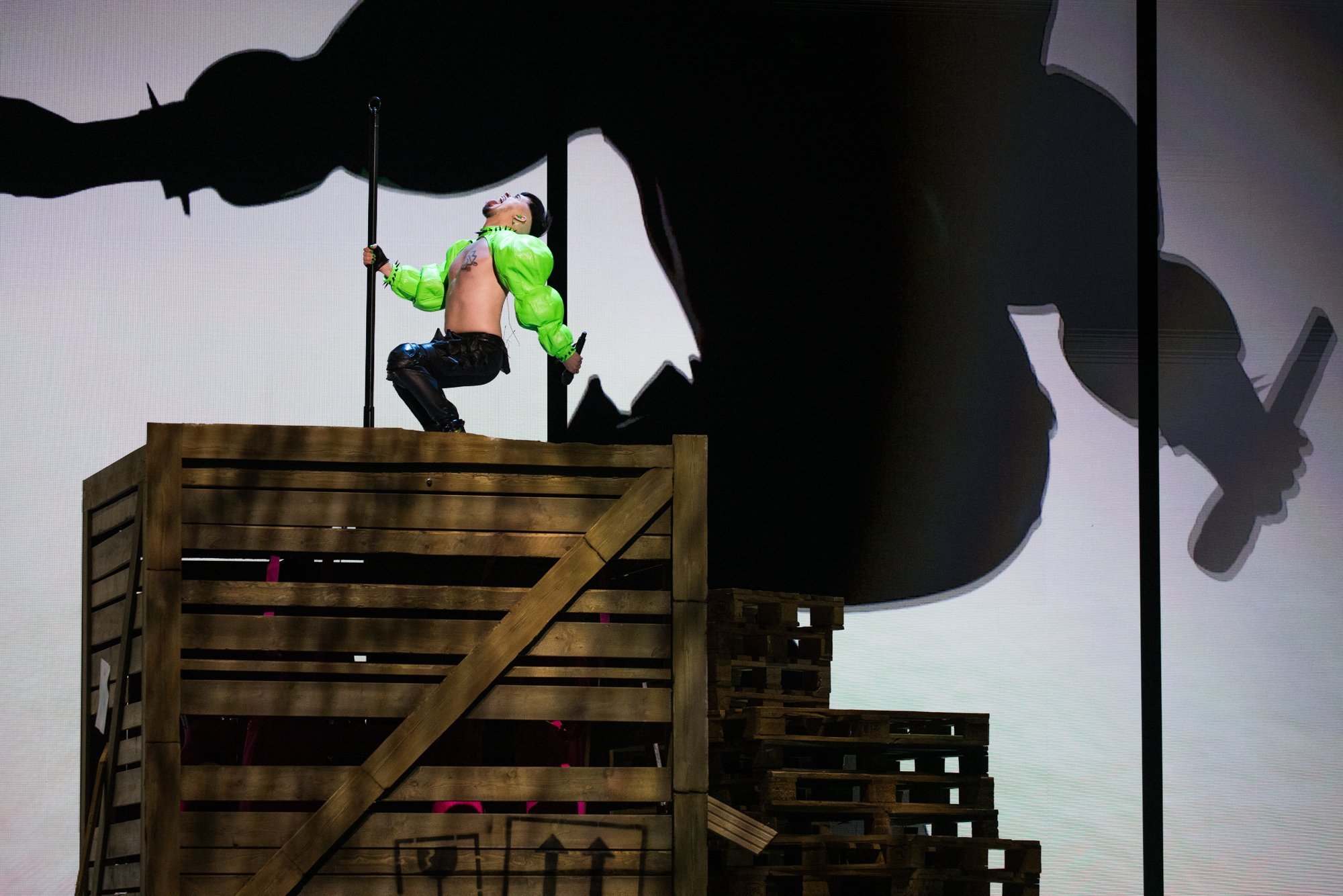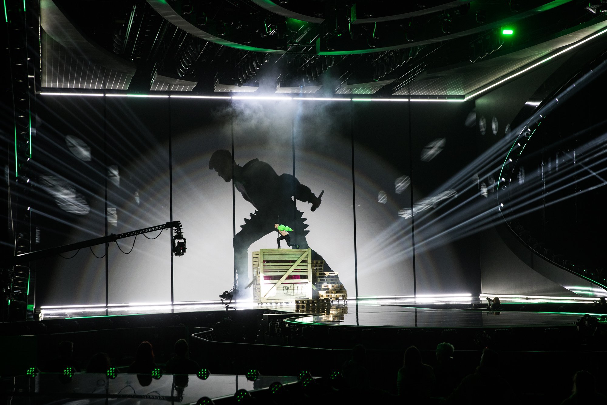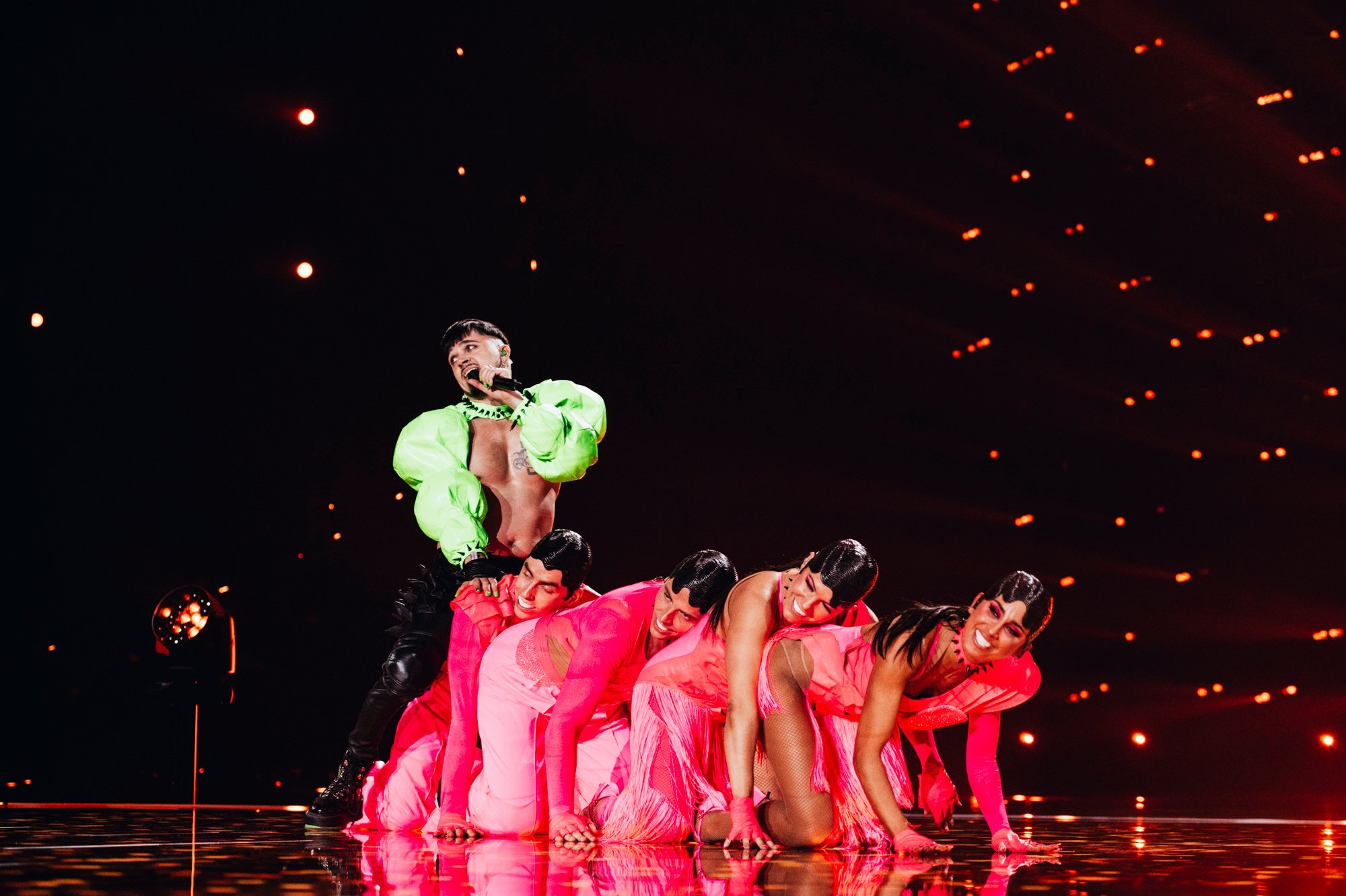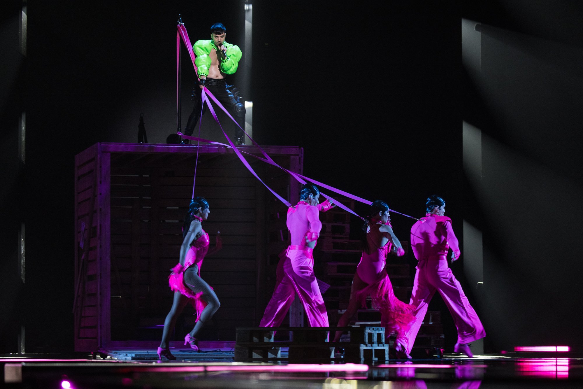 Käärijä’nın asit yeşili bolero ceketinin dört pembe giyimli dansçıyla birlikte Liverpool’a ulaştığını doğrulamaktan mutluluk duyuyoruz. Ayrıca bir palet yığını ve kocaman bir tahta kutu da var. Performansa kutunun içinde başlıyor, sonra üstüne tırmanıyor ve yere dönmeden ve dansçılarını benzersiz bir şekilde bir rutinde yönlendirmeden önce birkaç hamle yapıyor.1 point
