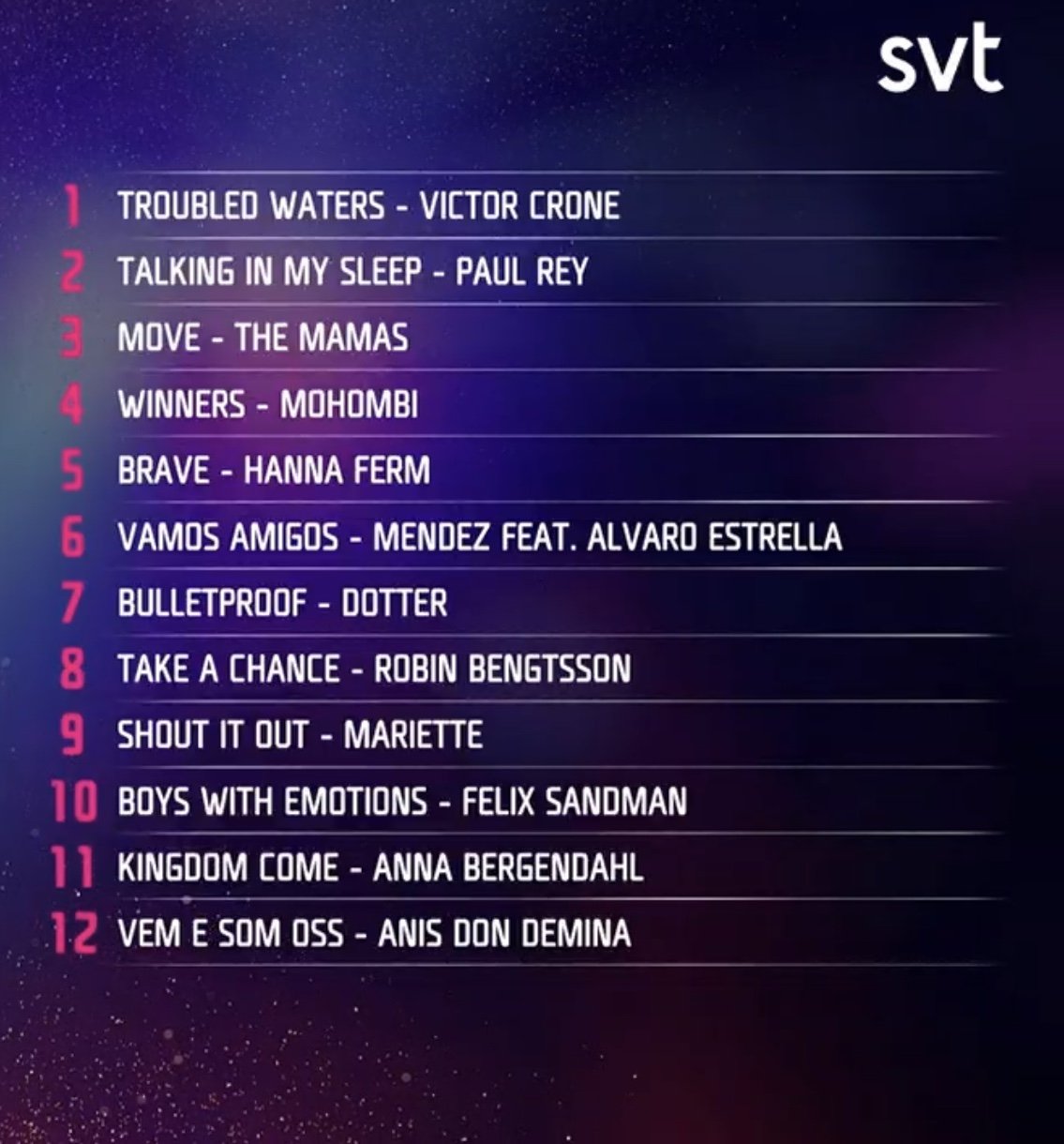 Züreyfa 29 Şubat, 2020 gönderildi 29 Şubat, 2020 gönderildi Finaldeki kadın yoğunluğunu azaltmak istercesine bütün erkekleri finale çıkardı İsveçliler. 1