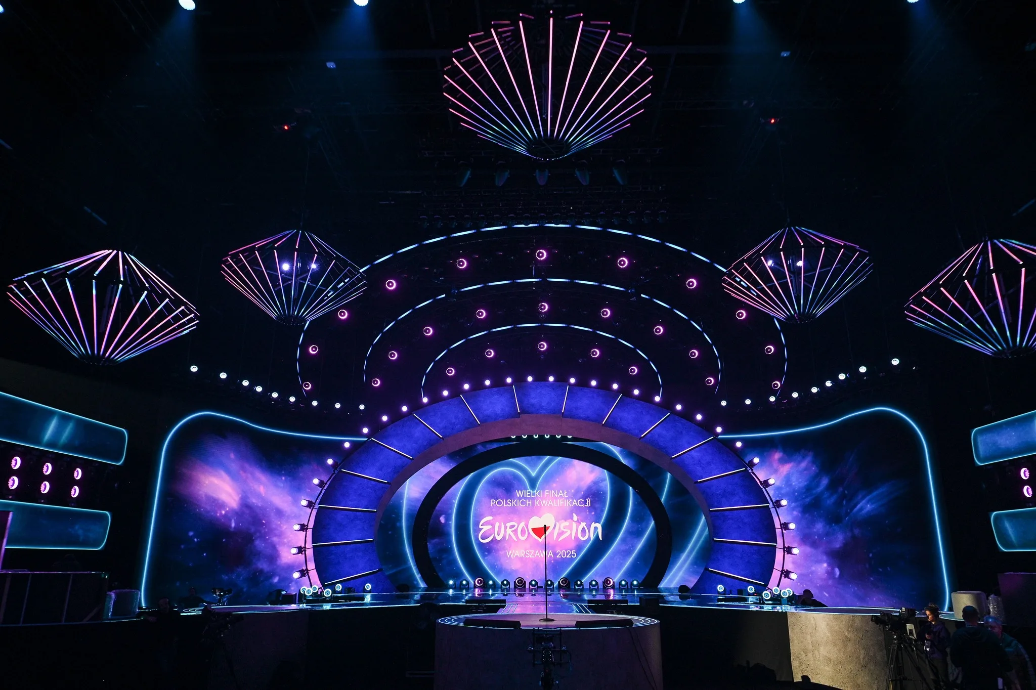Polonya devlet kanalı TVP, yarın akşam Polonya’nın başkentinde düzenlenecek olan Polonya’nın 2025 Eurovision ulusal finali “Wielki finał polskich kwalifikacji 2025” için ilk sahne görsellerini paylaştı. Sahne, arkada üç büyük ekran ve ana sahneden uzanan üç farklı podyum içeriyor. Orta podyumun seyirci alanına doğru ilerlemesi, sahneye dinamik bir yapı kazandırıyor.